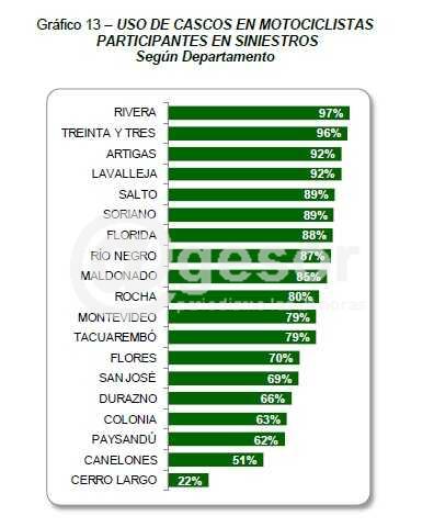 Donde entre los motociclistas que protagonizaron un siniestro de tránsito en 2014 en Soriano el 89% llevaba puesto el casco protector ubicando a nuestro departamento en quinto lugar a nivel nacional.