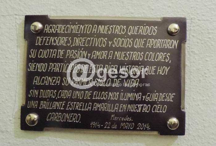 Previo a la sesión que la Liga Departamental de Fútbol de Soriano mantuvo en la noche de este jueves en la sede social delClub Peñarol de Mercedes, en honor a sus 100 años de vida, se realizó una emotiva ceremonia, enmarcada en la celebración del centenario aurinegro. En la oportunidad, con la presencia del actual Presidente peñarolense, Oscar Méndez, y otros dirigentes, hinchas y amigos del club, se descubrió una placa recordatoria para testimoniar el agradecimiento a quienes han fallecido pero que sin dudas son parte de la rica historia de la institución. Al respecto, hizo uso de la palabra Enrique Mezquida, integrante de la comisión de festejos. La placa, ubicada en la galería de ingreso a la sede, señala: “Agradecimiento a nuestros queridos defensores, directivos y socios que aportaron su cuota de pasión y amor a nuestros colores, siendo partícipes de esta rica historia que hoy alcanza su primer siglo de vida. Sin dudas, cada uno de ellos nos ilumina y guía desde una brillante estrella amarilla en nuestro cielo carbonero. Mercedes – 1914- 22 de mayo – 2014".
