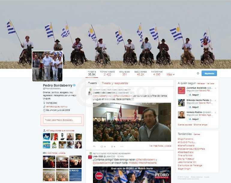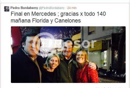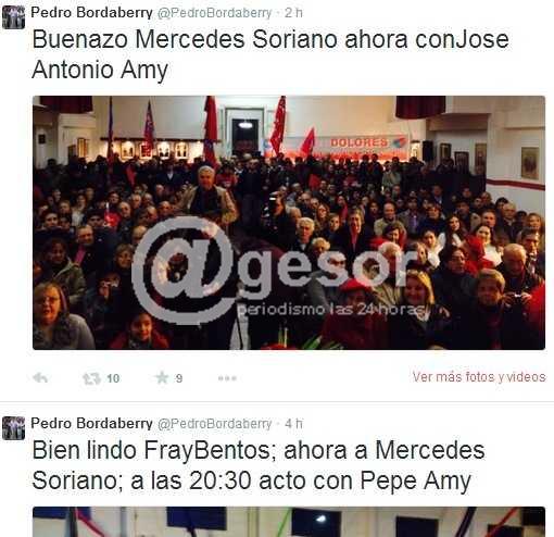 Las nuevas tecnologías y las redes sociales han cambiado la forma de comunicación y de interactuar. Y eso se refleja también en la campaña electoral, donde los candidatos constantemente están actualizando la información adelantando por dónde andarán, sus propuestas o planes, o replicando algunos dichos o críticas. Pedro Bordaberry estuvo este viernes recorriendo Soriano, y como se sabe es un asiduo usuario de Twitter, la red social en los últimos años se ha popularizado a influjo de los teléfonos celulares. Antes de comenzar el acto realizado en Mercedes se lo vio tomar fotografías con su celular que al instante publicó en twitter. Previo a ello había comunicado en twitter: “Bien lindo Fray Bentos; ahora Mercedes Soriano”. Cuando culminó el acto en Mercedes Bordaberry se tomó una fotografía con el diputado José Amy y su señora, y la publicó en twitter agradeciendo el recibimiento.