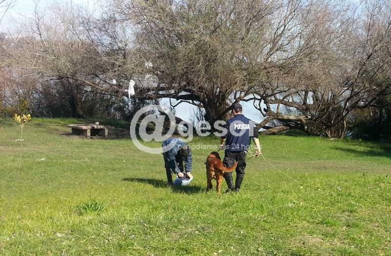 Ya en Los Arrayanes, tras detenerse a dialogar con algunos vecinos se dirigieron hacia el fondo del barrio o paraje, donde los funcionarios se colocaron indumentaria especial y bajaron uno de los dos perros adiestrados al que hicieron olfatear la prenda de Nicolás y salieron a recorrer la franja costera sobre el fondo de Los Arrayanes.
