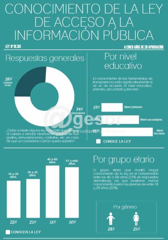 El 74% de la población desconoce la existencia de la ley de acceso a la información pública. A más de cinco años de aprobada la ley que regula el Derecho de Acceso a la Información Pública (18.381), tres de cada cuatro uruguayos desconoce la existencia de la norma que obliga al Estado a brindar información en caso de que un ciudadano la solicite. El dato surge de una encuesta realizada a pedido de la Unidad de Acceso a la Información Pública en noviembre del año pasado.