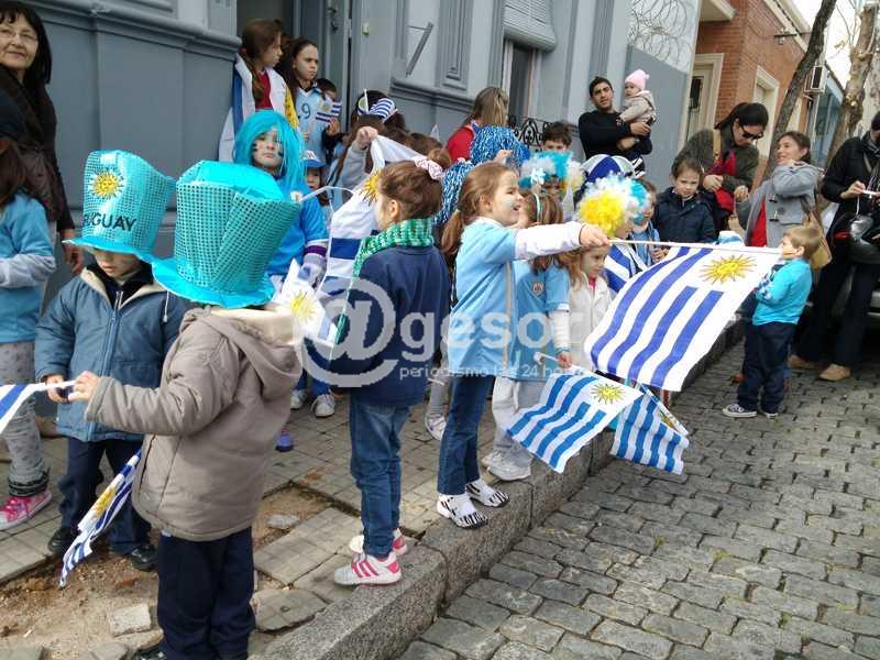 Una postal distinta mostraron sobre horas del mediodía los niños que concurren al Instituto de Alianza Mercedes (Uruguay-EEUU), que se encuentra ubicado en la esquina de Artigas y Rivas de la capital sorianense. Todos juntos salieron a la calle con motivos celestes, sumando votos para que Uruguay tenga un buen debut en la Copa Mundial de Brasil 2014. Tanto padres como demás familiares de los chicos se acercaron al lugar a acompañar esta celebración especial.