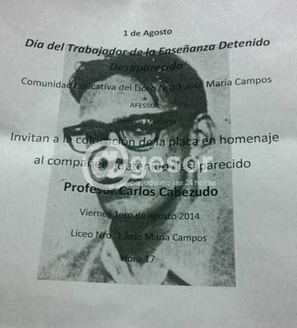 Dia del Trabajador de la Enseñanza Detenido Desaparecido.Homenajean en este marco al profesor Carlos Cabezudo. El acto será a las 17 horas en el Liceo José María Campos de Mercedes.