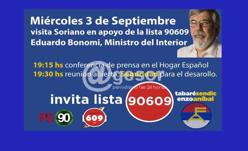 Miércoles 3 de setiembre visita Soriano en apoyo de la lista 90609 Eduardo Bonomi- Ministro del Interior.