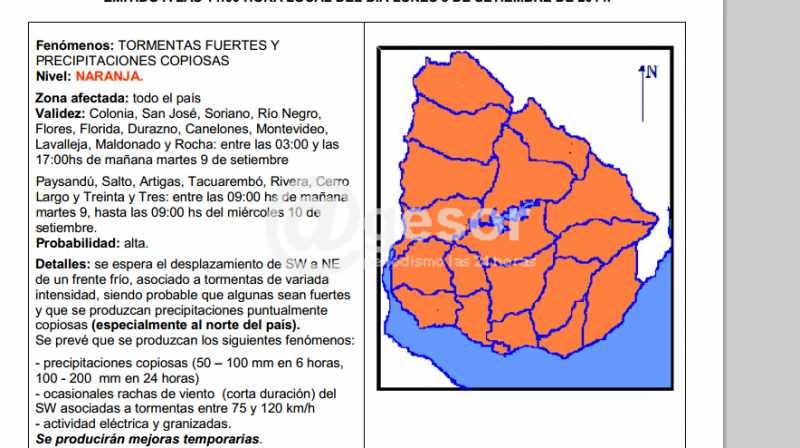 Fundamentalmente tiene validez para: Colonia, San José, Soriano, Río Negro, Flores, Florida, Durazno, Canelones, Montevideo, Lavalleja, Maldonado y Rocha: entre las 03:00 y la 17:00hs de mañana martes 9 de setiembre. Para Paysandú, Salto, Artigas, Tacuarembó, Rivera, CerroLargo y Treinta y Tres: entre las 09:00 hs de mañana martes 9, hasta las 09:00 hs del miércoles 10 de setiembre.