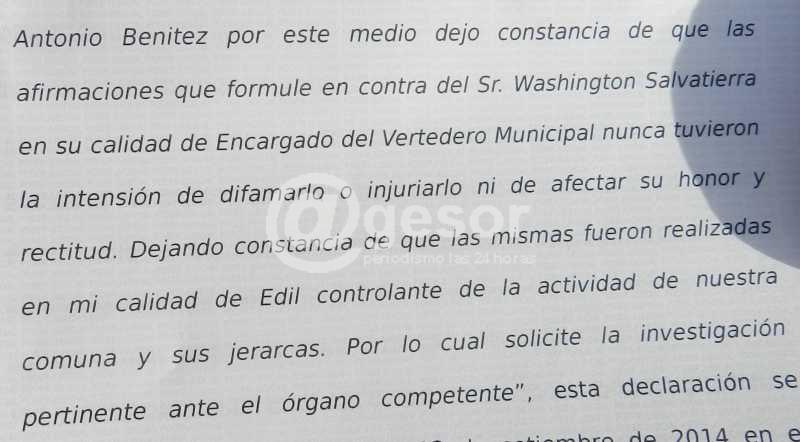 El texto acordado es el siguiente: "Antonio Benítez por este medio dejo constancia de que las afirmaciones que formulé en contra del Sr. Washington Salvatierra en su calidad de Encargado del Vertedero Municipal nunca tuvieron la intención de difamarlo o injuriarlo ni de afectar su honor y rectitud. Dejando constancia de que las mismas fueron realizadas en mi calidad de Edil controlante de la actividad de nuestra comuna y sus jerarcas, por lo cual solicité la investigación pertinente ante el órgano competente".
