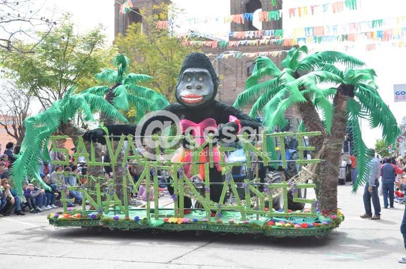 A las 12.43 inicia su pasaje la última carroza la N° 9 de Sextos Unidos Liceo Taruselli, “SALVAJEMENTE ENAMONADOS” con las princesas Bettina Sosa, Shirley Mernies.