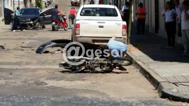 Al llegar a la intersección el auto blanco logra evitar por la derecha pasando detrás de la moto y el Peugeot acelera e impacta en la moto haciendo que el motociclista volara por el aire y cayera en la esquina suroeste en la vereda, perdiendo el casco.