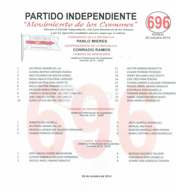 El Partido Independiente en Soriano presenta dos opciones electorales a través de las listas 696 y 909, encabezadas por la fórmula Pablo Mieres - Conrado Ramos y los dos candidatos a diputado son Roberto Baz y Federico Prado. Adjuntas ofrecemas las dos hojas de votación.