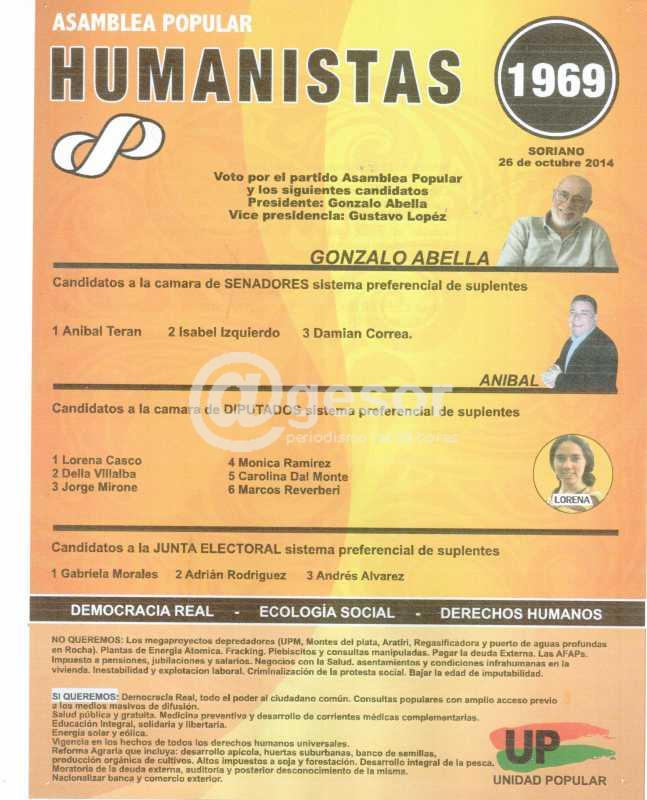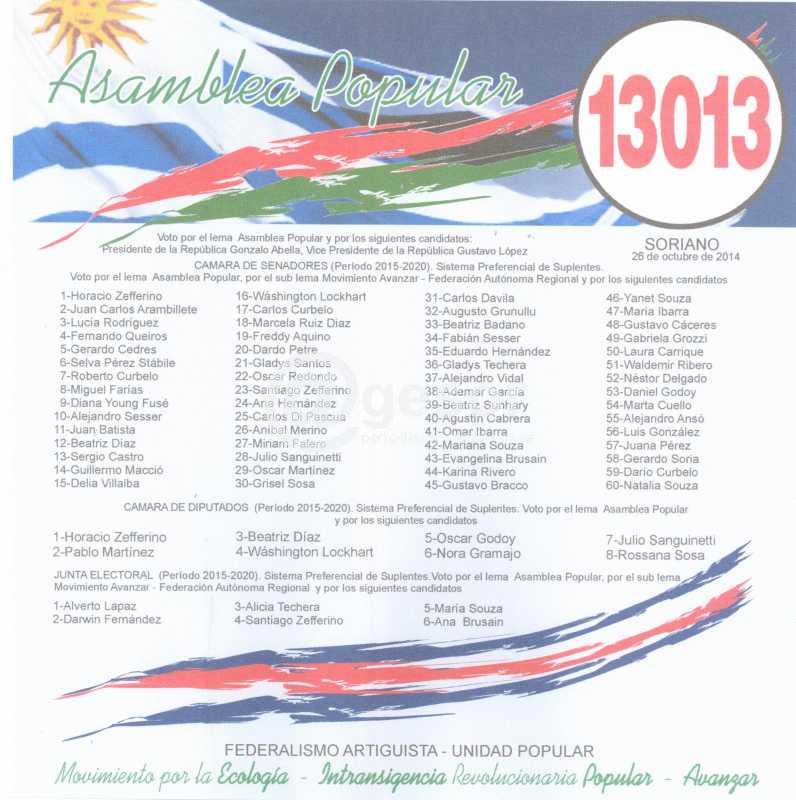 Asamblea Popular en Soriano presenta cinco opciones electorales a través de las listas 326, 960, 1969, 3060 y 13013, encabezadas por la fórmula Gonzalo Abella - Gustavo López y los cinco candidatos a diputado son Raúl Perdomo, Carlos Bastos, Lorena Casco, Daniela Spinelli y Horacio Zefferino. Adjuntas ofrecemas las dos hojas de votación.
