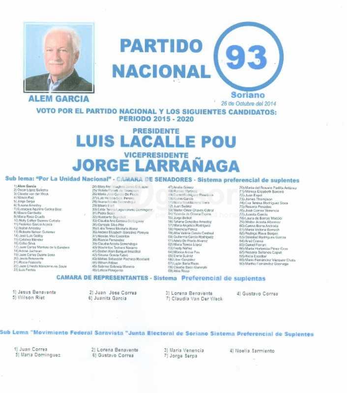 El Partido Nacional en Soriano presenta cuatro opciones electorales a través de las listas 93, 404, 903 y 2903, encabezadas por la fórmula Luis Lacalle Pou y Jorge Larrañaga, los cuatro candidatos a diputado son Jesús Benavente, Martín Irisarri, Guillermo Besozzi y Miguel Rondán. Adjuntas ofrecemos las dos hojas de votación.