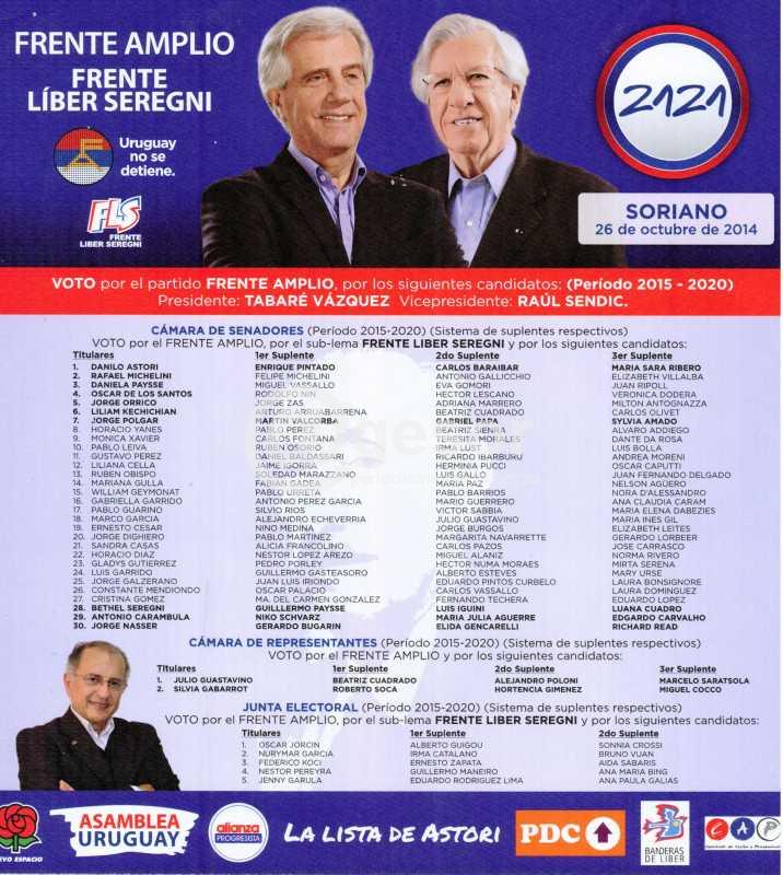 Quienes deseen votar la Lista 2121 del Frente Amplio podrán retirarla en el Comité del Frente Líber Seregni en Giménez y Haedo en Mercedes, comité Palo Alto en Ferreira Aldunate y Suárez, en la sede central del Frente Amplio en Ferreira Aldunate entre Ituzaingó y Oribe y en kioscos en plaza Artigas y plaza Independencia.
