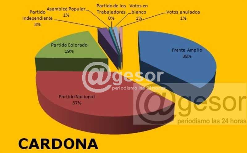 El Frente Amplio fue el lema más votado en Cardona, superando al Partido Nacional por 35 sufragios 2006 a 1971 y en tercer lugar el Partido Colorado con 1.010 adhesiones.