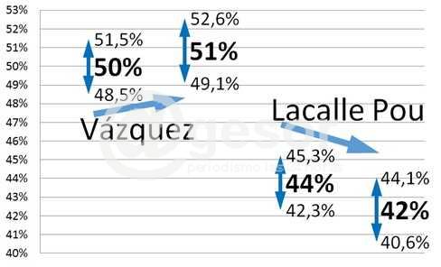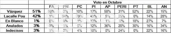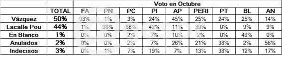 Asumiendo que la tendencia sea firme, es posible discriminar las cifras según el voto en la elección del pasado octubre. Hacia el 26 de octubre el escenario era el siguiente: Vázquez 50%, Lacalle Pou 44%, en blanco 1%, anulados 2%, indecisos 3% (ver foto 3)