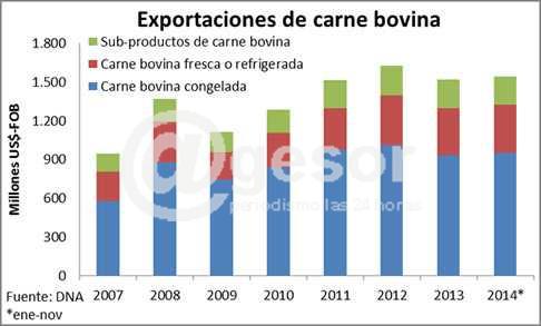 Entre enero y noviembre de 2014 se exportó carne bovina y sus derivados por un monto de US$ 1.534 millones, lo que significó un aumento de 10,9% frente a igual periodo del año anterior. De este modo, 2014 se perfila como un año récord en exportaciones de estos productos. El 62% de estas ventas fueron carne bovina congelada, el 24% carne refrigerada, mientras que el 14% correspondieron a sub-productos como achuras, grasa, harina de carne y corned beef.