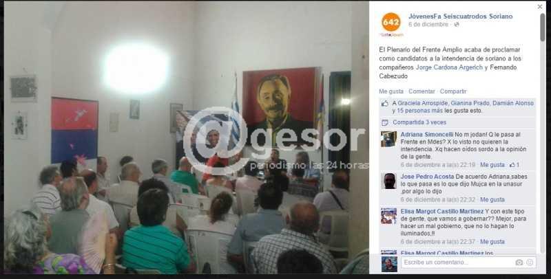 La decisión adoptada por el Plenario Departamental del Frente Amplio de impulsar dos candidaturas a la Intendencia de Soriano generó una casi inmediata reacción en las redes sociales. Varios frenteamplistas felicitaron a Jorge Cardona y Fernando Cabezudo, los dos candidatos que presentará la izquierda en las elecciones de mayo próximo, pero muchos otros expresaron su disconformidad.