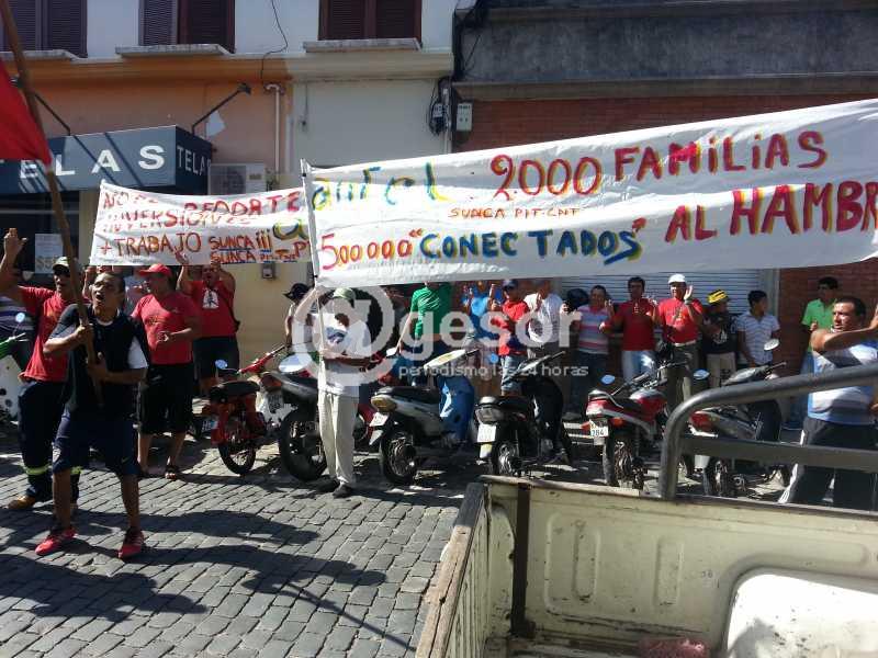 Apoyados por el SUNCA, trabajadores de la empresa GOFINAL se manifestaron frente a las oficinas de ANTEL Mercedes, en rechazo a la decisión del organismo a nivel nacional, referida al cese de los trabajos de conexión de fibra óptica, que motiva la interrupción de tareas a cerca de unos 2000 trabajadores de todo el país y en particular a unos 60 de Mercedes y Dolores.