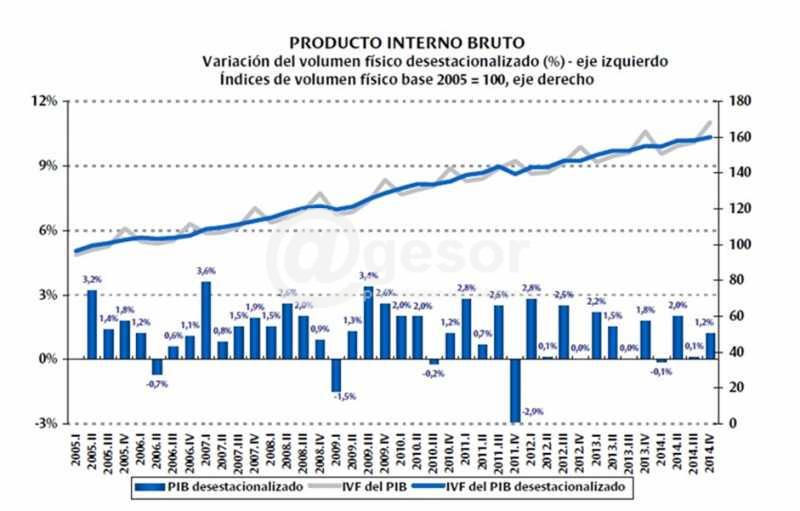 A su vez, y en términos desestacionalizados, el PIB del cuarto trimestre registró un incremento de 1,2% en relación con el trimestre inmediato anterior, debido al comportamiento positivo de la mayoría de las actividades, destacándose la incidencia de las Industrias Manufactureras y el Transporte, almacenamiento y comunicaciones, que fueron compensadas parcialmente por la caída en las actividades de Comercio, reparaciones, restaurantes y hoteles.