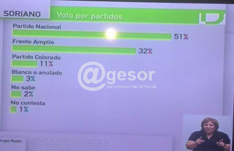 Radar informó que el Partido Nacional recibe el 51% de intención de voto de cara a las Elecciones Departamentales del domingo 10 de mayo. El Frente Amplio se ubica en segundo lugar con 32%, mientras que el Partido Colorado recibe 11%, el 3% votaría en blanco o anulado, no sabe 2% y no contesta 1%.