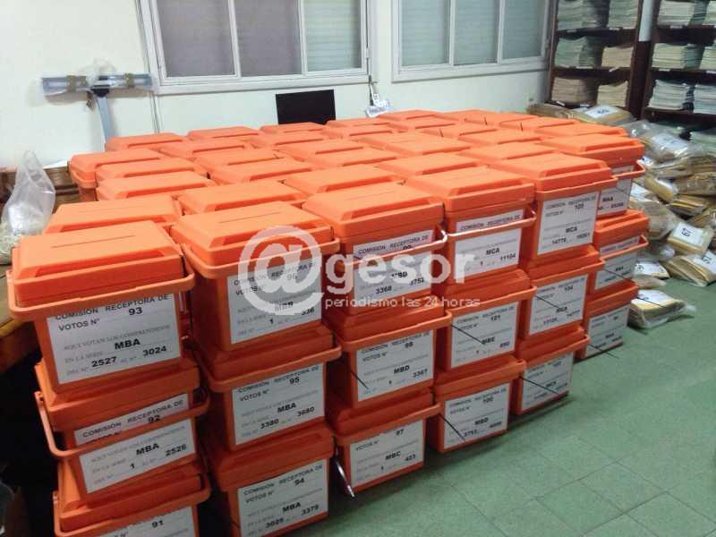 Las urnas de plástico que sustituyen definitivamente a las de chapa que están acondicionadas -como lo muestra la fotografía- en la planta baja del edificio, para ser enviadas a depósito, el padrón electoral, las carpetas, sobres con las hojas de votación de cada uno de los circuitos, proporcionadas por los propios partidos políticos y sectores, pertimiendo que estén presentes en los 208 circuitos.