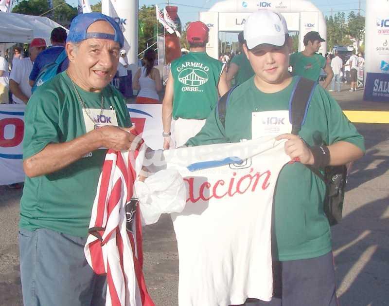 En la fotografía, Buby junto a uno de sus nietos, Guillermo, en ocasión de realizar la 10 K Bimbo, tras cruzar la meta cumpliendo el recorrido, con sus dos amores, la casaca de Diario Acción y la camiseta del Decano, Mercedes Rovers F.C. que tanto amó.