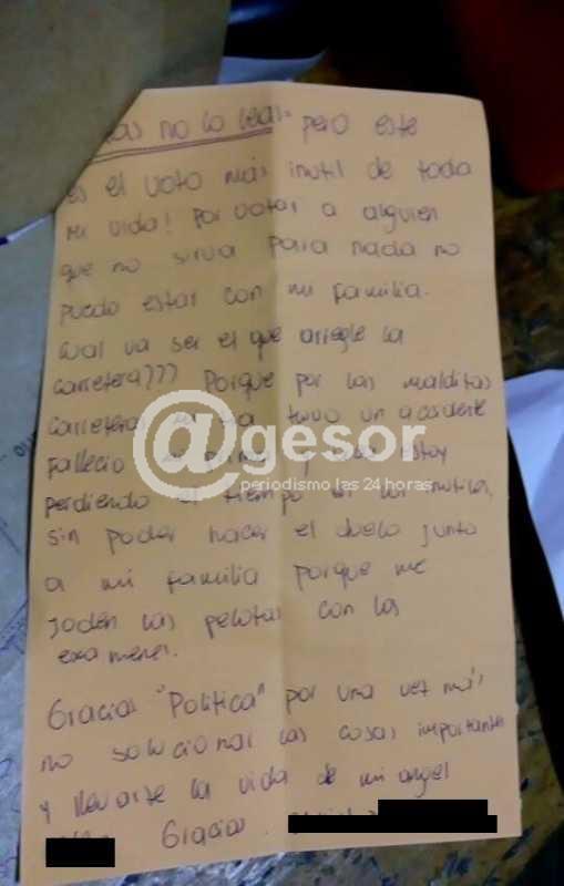 El domingo de noche, en plena vorágine del trabajo informativo una consecuente lectora de @gesor que ese día integró una mesa de votación nos comunicó sobre un voto donde una votante se quejaba “ este es el voto más inútil de toda mi vida! Por votar a alguien que no sirve para nada no puedo estar con mi familia. Cuál va a ser el que arregle la carretera?? Porque por las malditas carreteras mi tía tuvo un accidente falleció mi prima y acá estoy perdiendo el tiempo en (no se entiende) sin poder hacer el duelo junto a mi familia porque me joden las pelotas con los exámenes. Gracias “Política” por una vez más no solucionar las cosas importantes y llevarse la vida de mi ángel” (si bien esta carta esta firmada nos reservamos el nombre).