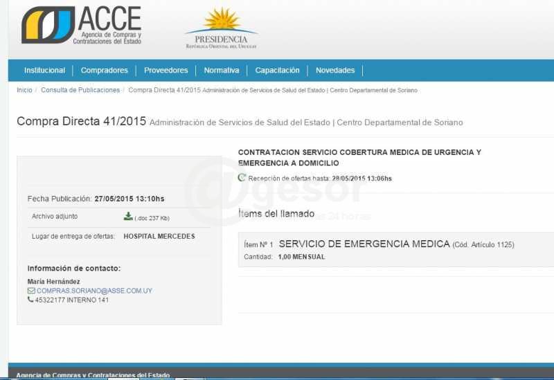 Un llamado ya previsto, trabajado, en el marco de un operativo, ¿puede estar nada más que 24 horas abierto? ¿O simplemente se abrió para que se presentara alguna empresa con la que se había hablado antes? Que cada uno saque sus conclusiones, como dato complementario le informamos que en los llamados que venía haciendo el hospital para contratar este mismo servicio pero solamente para la clave 1, que hasta el 31 de mayo lo prestó Vivem, estuvo publicado cinco días, al igual que el llamado para contratar ambulancia, también publicado durante cinco días, en este caso no alcanzó a 24 horas, como lo muestra la fotografía del llamado extraida de la página de las compras estatales.