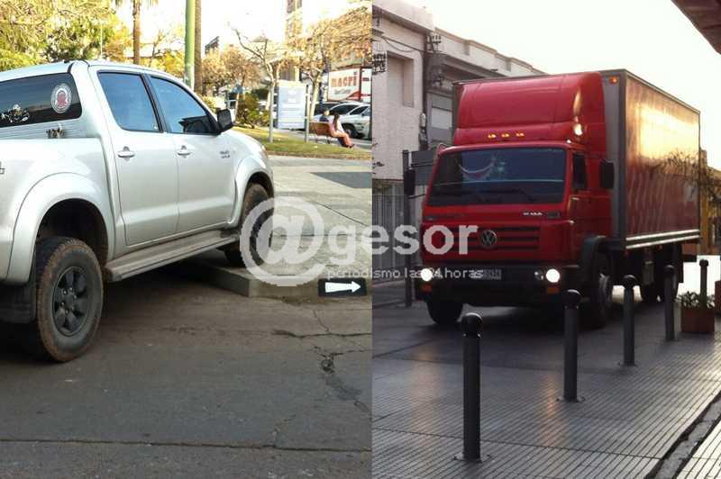 Por otra parte, se ve a una camioneta mal estacionada con la parte delantera sobre la vereda de la Plaza Independencia de Mercedes.