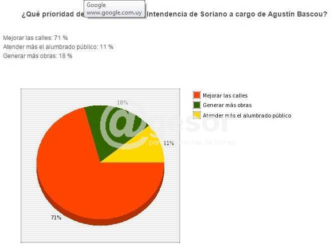 El arreglo de las calles debería ser la prioridad del gobierno de Agustín Bascou, según los lectores de @gesor. En nuestra encuesta virtual el arreglo de las calles es la preocupación principal de la población (71%), seguido de generar más obras para el departamento (18%) y atender el alumbrado público (11%).