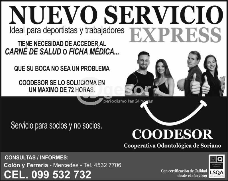 Desde este viernes la Cooperativa Odontológica de Soriano (COODESOR) comenzó a contar con un nuevo servicio express, que consiste en acondicionamiento bucal para aptitud de carné de salud y ficha médica, labor que se realiza en un máximo de 72 horas.