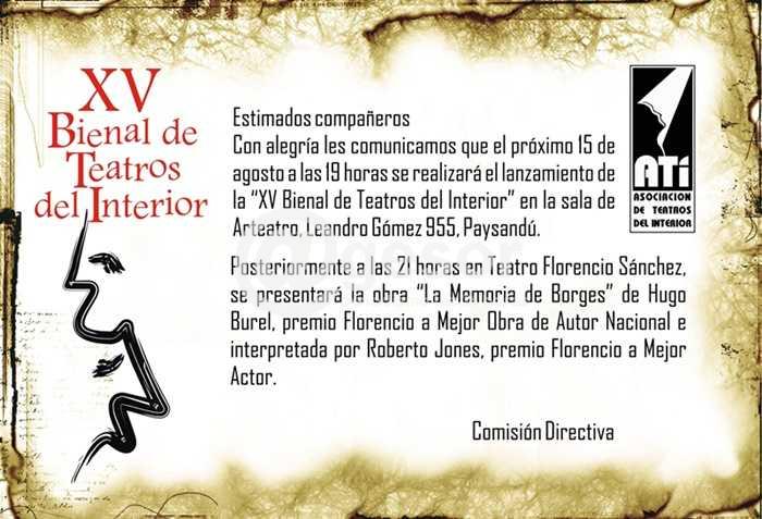 El sábado 15 de agosto se realizará en Paysandú el lanzamiento de la XV Bienal de Teatros del Interior. Se realizará en la sala de Arteatro (Leandro Gómez 955, Paysandú), y esta edición llevará el nombre de "Gonzalo Pérez Sallaberremborde".