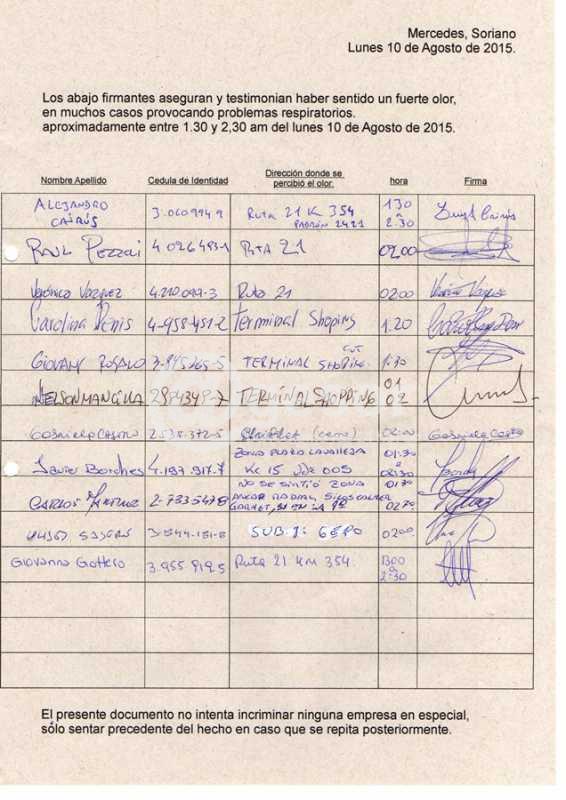 Alejandro Cairús, un vecino del ejido de Mercedes, relató a @gesor lo sucedido en la madrugada del lunes y que pudo constatarse en una amplia zona de la ciudad. Acompañado de una carta y la notificación enviada a la DINAMA (Dirección Nacional de Medio Ambiente) alertando de los sucedido, Cariús nos relató: “A la 1,30 del lunes nos despertó a mi señora y a mi un olor nauseabundo y químico, muy similar al que despiden las garrafas de gas cuando se agotan, un olor químico pero combinado con un olor fétido como a cloaca. El personal de la Seccional 3era, donde dejé asentado lo ocurrido, (a las 2 AM aproximadamente) me manifestó que también había sentido, no solo en la Seccional, que esta a un kilómetro de nuestra casa, sino en varios puntos de la ciudad”. Agregó que “el olor que se sintió fue mucho más fuerte y químico que los que siempre se sienten del encierro de ganado Il tramonto, ésta vez si bien el viento venía del mismo lado, provocó efectos secundarios, por ejemplo mi señora paso 24 horas con dolor de cabeza y alergia respiratoria (lo mismo manifestaron algunos oficiales de Policía).