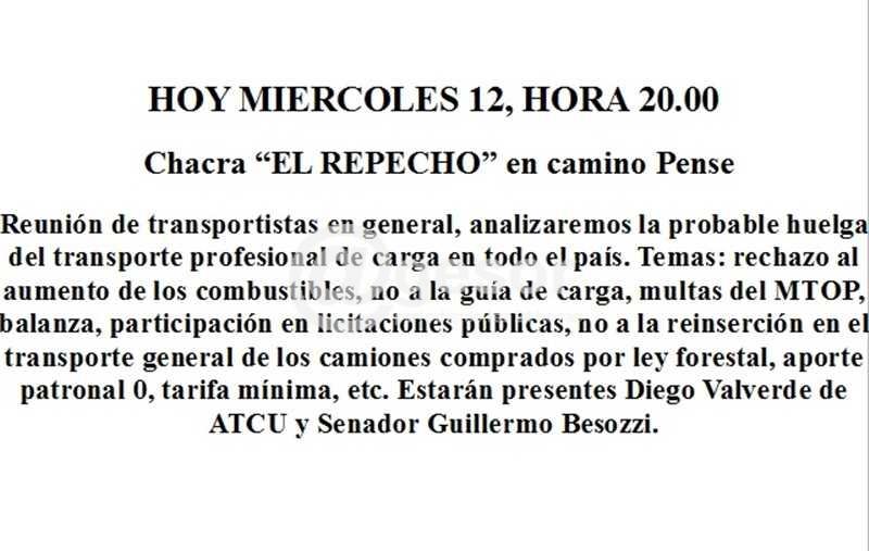 Reunión de transportistas en general, analizaremos la probable huelga del transporte profesional de carga en todo el país. Temas: rechazo al aumento de los combustibles, no a la guía de carga, multas del MTOP, balanza, participación en licitaciones públicas, no a la reinserción en el transporte general de los camiones comprados por ley forestal, aporte patronal 0, tarifa mínima, etc. Estarán presentes Diego Valverde de ATCU y Senador Guillermo Besozzi.