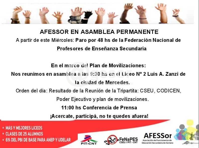 En el marco del Plan de Movilizaciones: Nos reunimos en asamblea a las 9.30 horas en el Liceo N° 2 Luis A. Zanzi de la ciudad de Mercedes