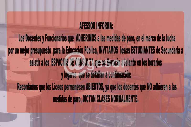 Los Docentes y Funcionarios que ADHERIMOS a las medidas de paro, en el marco de la lucha por un mejor presupuesto para la Educación Pública, INVITAMOS a los/as ESTUDIANTES de Secundaria a asistir a los ESPACIOS DE CONSULTA que se llevarán adelante en los horarios y lugares que se detallan a continuación: