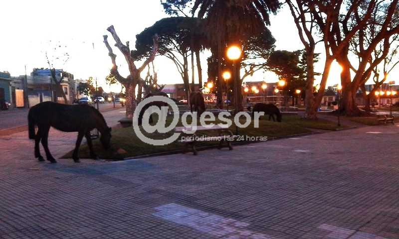 Caía la tarde en Mercedes cuando pudimos apreciar estas escenas en la Plaza Rivera, cuatro caballos sueltos pastando mansamente en una postal ciudadana que se está tornando habitual. Ayer dábamos cuenta de una situación similar, registradas en una fotografía por un lector de @gesor, ocurrida a pocas cuadras de allí. Días atrás, a los mismos animales u otros quizá, se los vio deamblando por otro punto de la ciudad. Hasta el momento, afortunadamente no ha ocurrido nada, pero la poca visibilidad al caer la tarde o algún otro factor pueden terminar conspirando para que ocurra lo que nadie quiere, ya que sin dudas los animales deben tener un lugar donde estar pero sin dudas no en las calles ya que constituyen un riesgo importante para el tránsito vehicular.