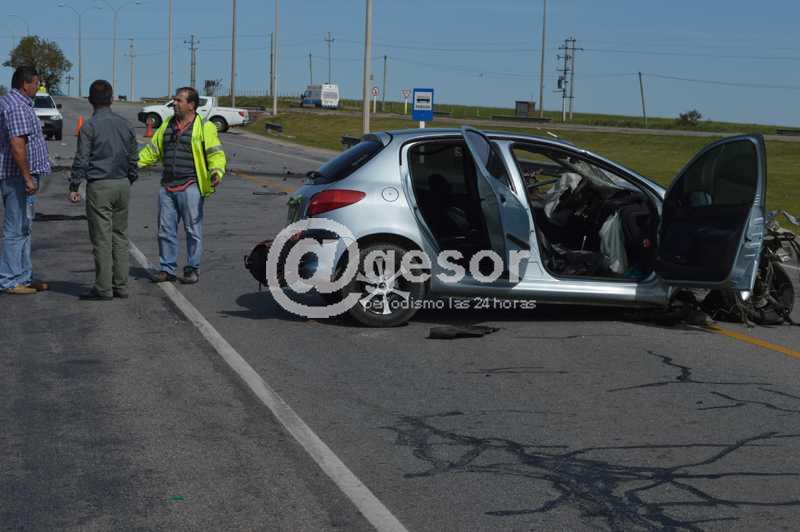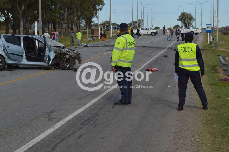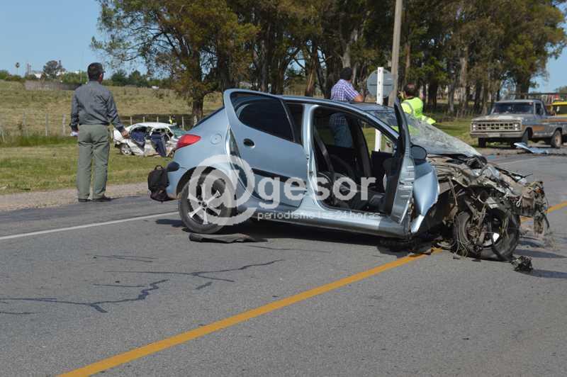 Un choque frontal entre dos vehículos dejó como saldo dos personas fallecidas y 4 lesionados. El siniestro carretero se produjo en rura 2 a la altura del kilómetro 243, a unos 200 metros antes de llegar a Palmitas (de Norte a Sur). En estos momentos personal policial, de bomberos, caminera y asistencia médica trabajan en el lugar. Por el momento no se ha podido determinar la causa que provocó el choque frontal entre los dos vehículos, que fue de tal magnitud que a uno de ellos, el automóvil Peugeot 206, perdió el motor quedando a unos 20 metros del impacto.