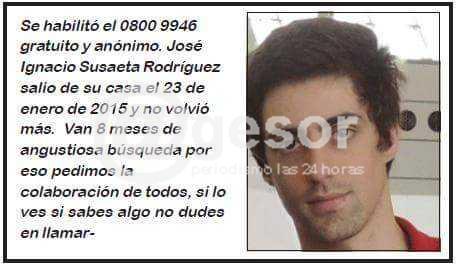 Dando cuenta que se habilitó una línea telefónica 0800 9946 (anónima y gratuita), familiares de Ignacio Susaeta Rodríguez mantienen de manera firme la búsqueda del joven que ya hace alrededor de 8 meses que desapareció. Ignacio Susaeta salió de su casa el 23 de enero de 2015 y no volvió más. Van 8 meses de angustiosa búsqueda, dice su familia que este lunes se comunicó con el 092 88 93 29 de @gesor.