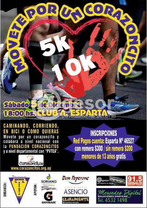 "Movete por un corancito" se llama actividad deportiva de 5k y 10k que tendrá lugar el sábado 5 de diciembre, a las 18:00 horas, en el Club Esparta. Caminando, corriendo, en bici o como quieras, movete por un corancito y colaborá a nivel nacional con la Fundación Corazoncitoos y a nivel departamental con PVTEA. La fundación cuenta con la página www.corazoncitos.org.uy. Las inscripciones se llevan a cabo a través de Red Pagos cuenta: Esparta Nº46527, con remera 300 pesos, sin remera $200, menores de 13 años gratis.