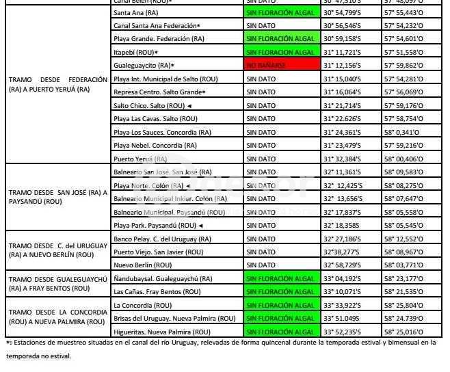 No hay presencia de algas, más reconocidas por el color verdoso que le aportan al agua, en las playas sobre el río Uruguay que abarcan los departamentos de Rio Negro, Soriano y Colonia (Nueva Palmira).