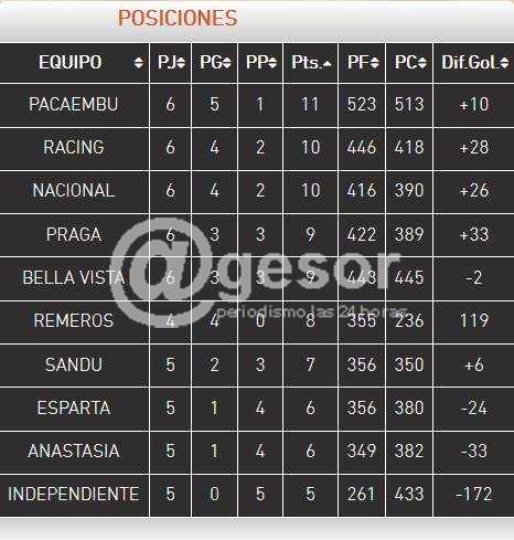 La derrota de Racing ante Praga, este martes, ha dejado a Pacaembú como el único puntero del Campeonato “Competencia” de la Liga Regional de Básquetbol de Soriano, “90 Años del Club Remeros Mercedes”, cuando está en disputa la Sexta Fecha de la primera ronda del certamen.