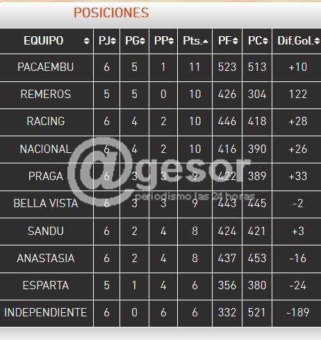 Pacaembú está al tope de la tabla de posiciones jugada la Sexta Fecha del Campeonato “Competencia” de la Liga Regional de básquetbol de Soriano, “90 Años del Club Remeros Mercedes”, con 11 unidades en su favor. Luego hay tres equipos con 10 puntos (Remeros, Racing y Nacional de Fray Bentos), aunque vale recordar que el equipo costero que conduce Francisco Garciarena tiene un partido menos, con Esparta.