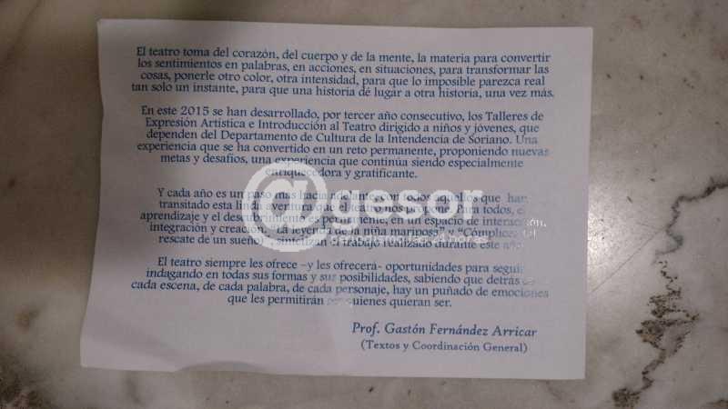 En este 2015 se han desarrollado, por tercer año consecutivo, los talleres de expresión artística dirigido a jóvenes y niños, que dependen del Departamento de Cultura de la Intendencia de Soriano. Una experiencia que se ha convertido en un reto permanente, proponiendo nuevas metas y desafíos, una experiencia que continúa siendo especialmente enriquecedora y gratificante.
