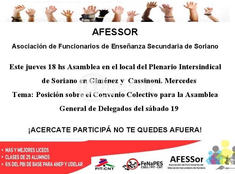 Este jueves 18 horas Asamblea en el local del Plenario Intersindical de Soriano en Giménez y Casscinoni, Mercedes.