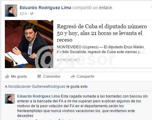 Quizá el más duro fue Eduardo Rodriguez Lima (dirigente de la lista 711 de Raúl Sendic): “Esta cagada sumada a las barriadas con Bascou sin enterar a la bancada del FA a mi me superan pero explican algunos de los motivos de la peor votación del FA en el departamento, serán los frenteamplistas que nunca vivimos vacaciones los que revirtamos este desastre”.