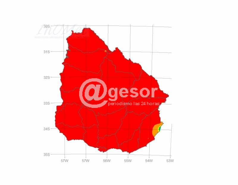 Como se puede apreciar en el mapa una escasísima porción del Este uruguayo se encuentra fuera del riego bajo, ya que los 19 departamentos uruguayos están en riesgo muy alto de que se produzcan incendios forestales.