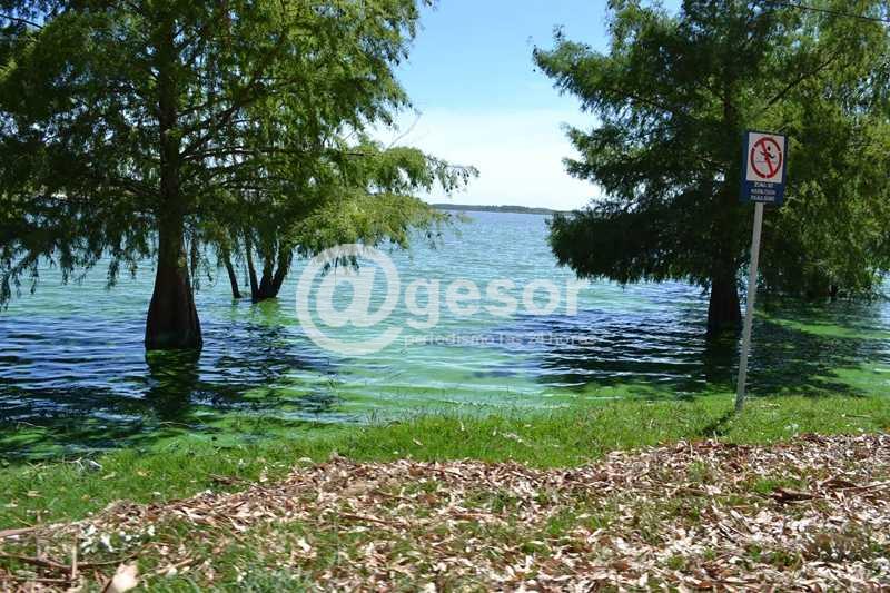 * masa verde brillante en la orilla, o sobre y/o en la columna de agua (alerta amarilla) en: