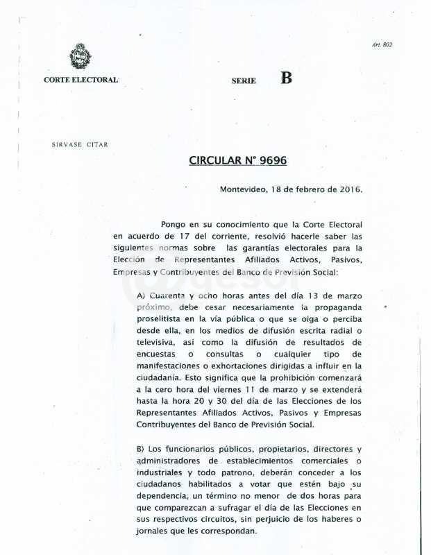 La Jefatura de la Oficina Electoral de Soriano, hace saber que la Corte en su acuerdo del día 17/02/2016, resolvió recordar las normas sobre garantías, electorales para la elección de representantes afiliados Activos, Pasivos y Empresas Contribuyentes, del Banco de Previsión Social que se realiza el 13/03/2016, a través de la Circular Nº 9.696 la que se adjunta para conocimiento de la Población General.