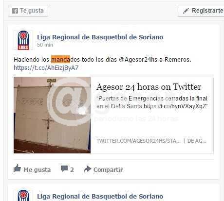 Alertados por algunos lectores, @gesor tomó conocimiento este sábado de un comentario aparecido en la cuenta de facebook de la Liga Regional de Básquetbol de Soriano, en el que se acusa a nuestra agencia de noticias de “hacer los mandados” al Club Remeros Mercedes. De manera sorpresiva, a poco de ser publicado el comentario fue eliminado. Textualmente el mismo señalaba: “Haciendo los mandados todos los días @gesor 24 horas a Remeros”.