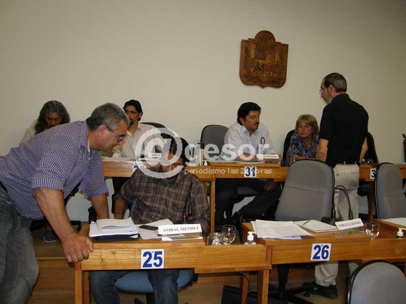(*) En la fotografía puede apreciarse un momento del cuarto intermedio, donde la bancada frenteamplistas discute por separado qué hacer con la propuesta del edil Yoffre de cuestionar al municipio doloreño.